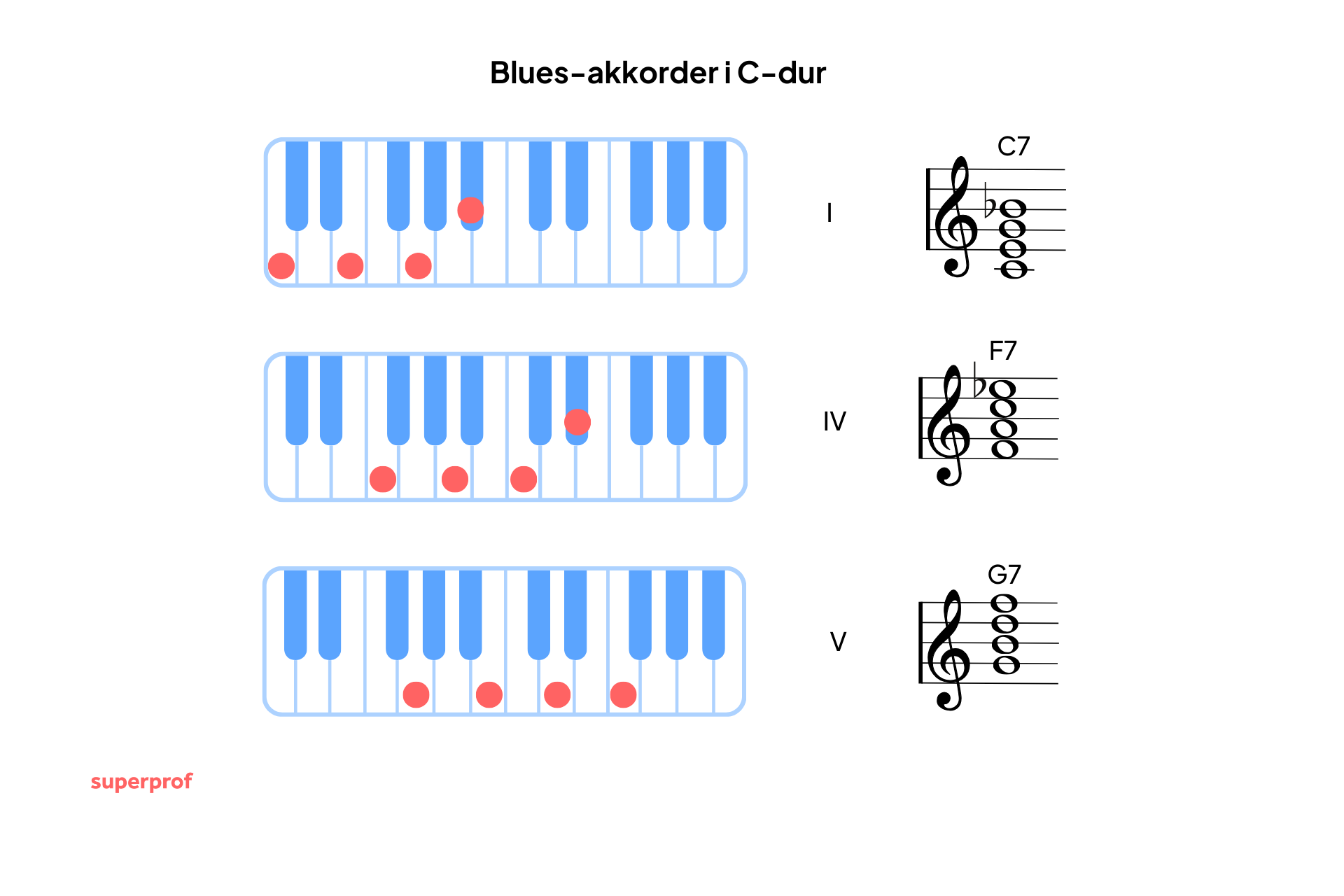 En klassisk blues – og i øvrigt også mange rocksange – bruger udelukkende akkorderne på 1., 4. og 5. trin. Som allerede nævnt spilles de i blues ofte alle som septimakkorder. Det betyder, at vi skal tilføje den lille septim til treklangen. I C-dur ser det således ud i noder og på klaveret: